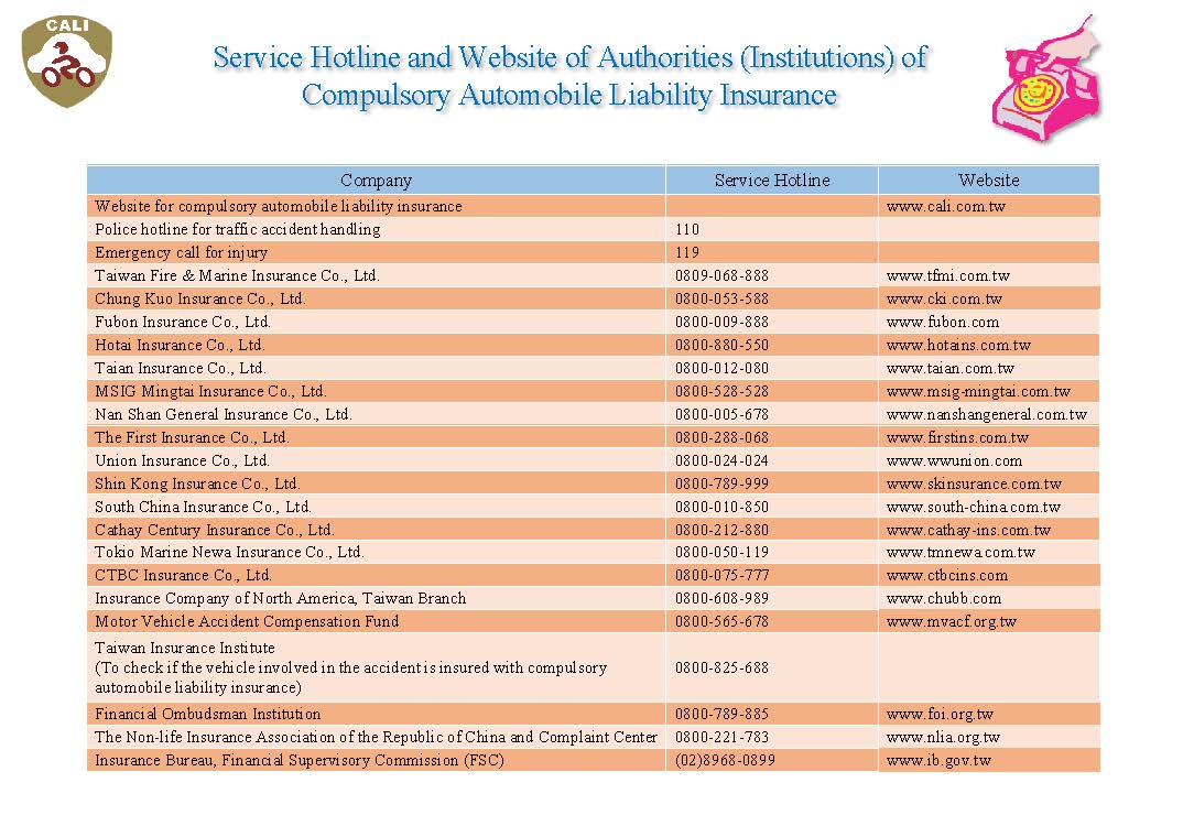 Service Hotline and Website of Authorities (Institutions) of Compulsory Automobile Liability Insurance