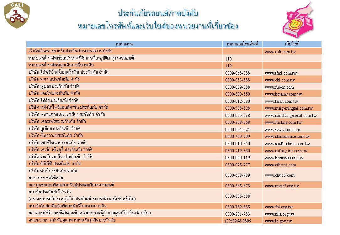 ประกันภัยรถยนต์ภาคบังคับหมายเลขโทรศัพท์และเว็บไซต์ของหน่วยงานที่เกี่ยวข้อง