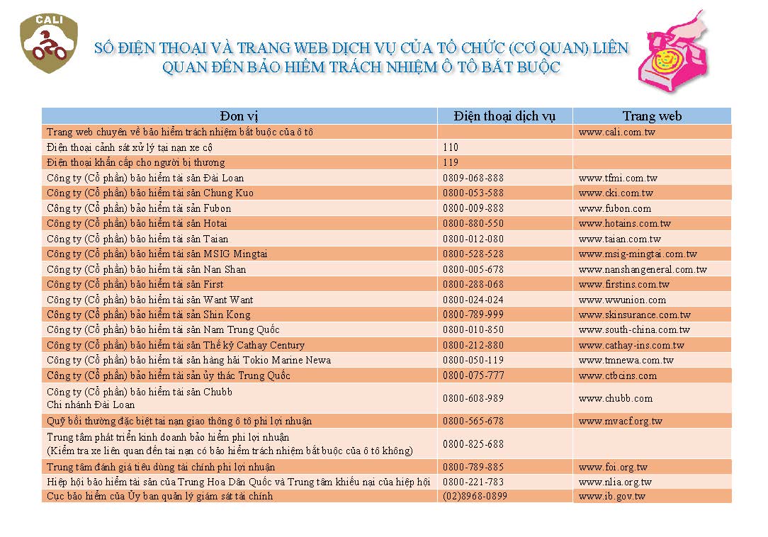 SỐ ĐIỆN THOẠI VÀ TRANG WEB DỊCH VỤ CỦA TỔ CHỨC (CƠ QUAN) LIÊN QUAN ĐẾN BẢO HIỂM TRÁCH NHIỆM Ô TÔ BẮT BUỘC